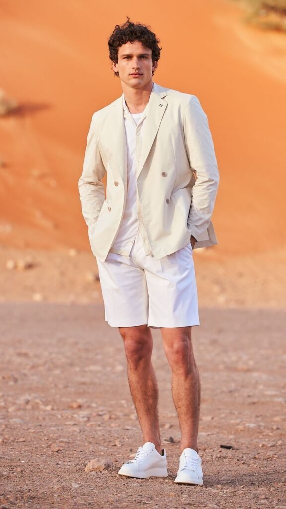 • How to wear it: Rock a beige linen blazer with a white tee and relaxed chinos. Skip the tie for a laid-back vibe.